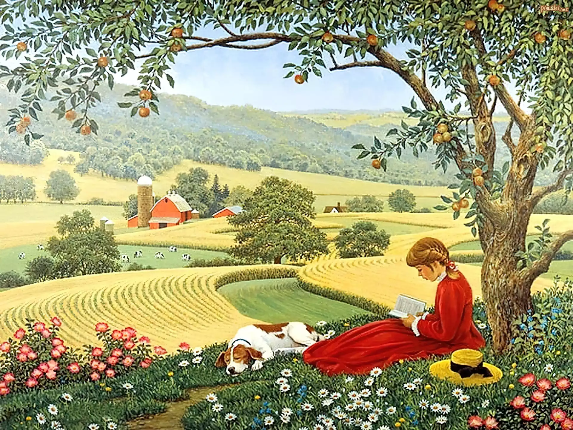 Dziewczyna, Pies, Łąka, Drzewo, Owocowe