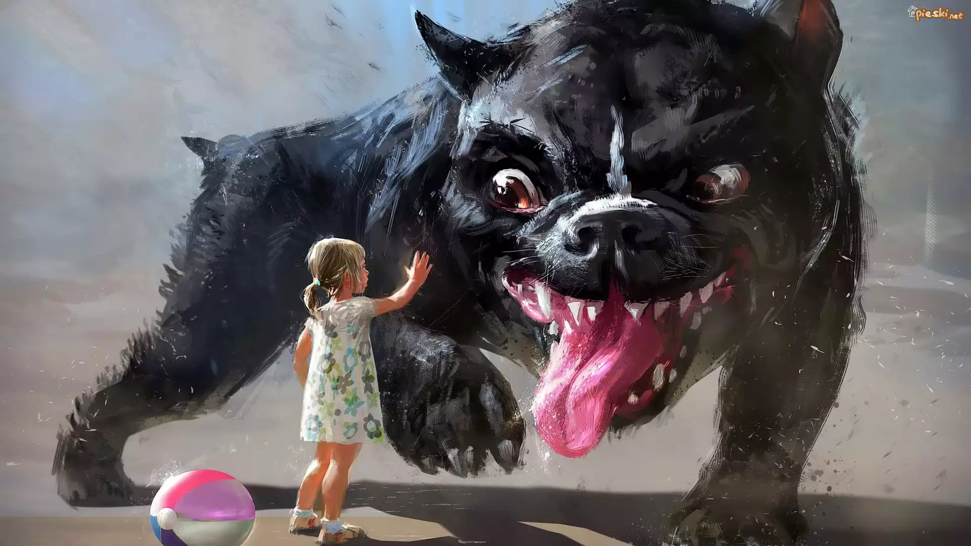 Pies Dziecko, Dziewczynka, Zły, Pies, Piłka, Digital Art