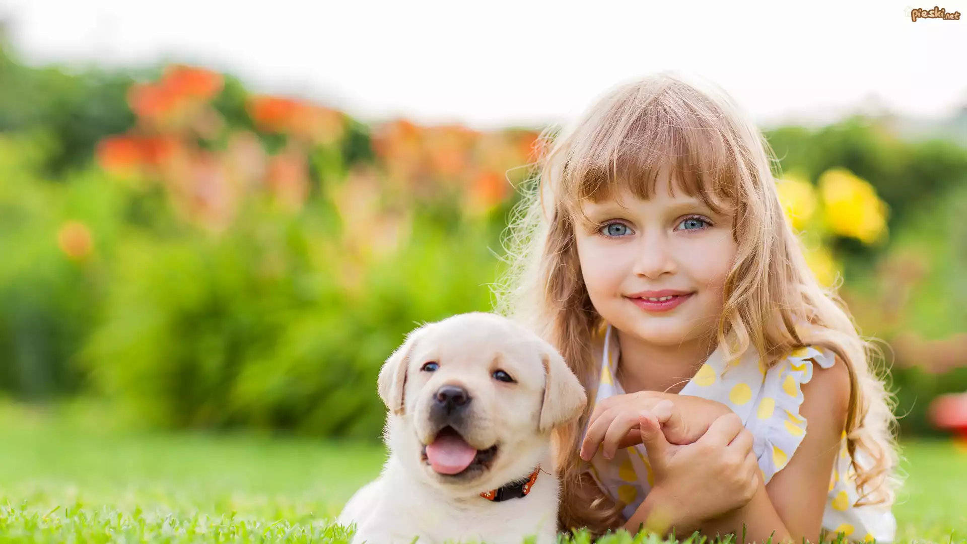 Dziewczynka, Szczeniak, Labrador retriever, Rozmyte tło