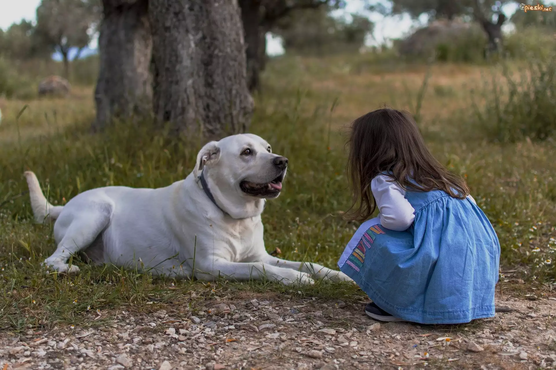 Dziewczynka, Pies, Trawa, Drzewa
