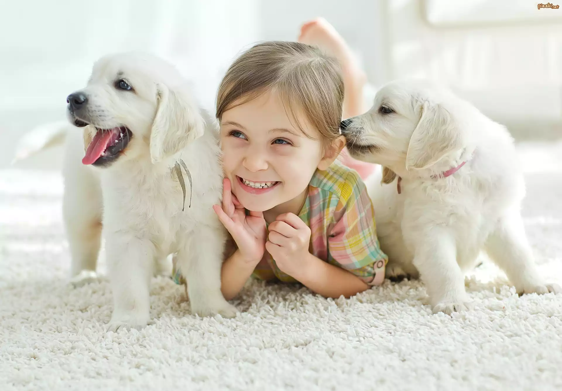 Pies Uśmiechnięta, Dziewczynka, Dwa, Białe, Szczeniaki, Golden retriever