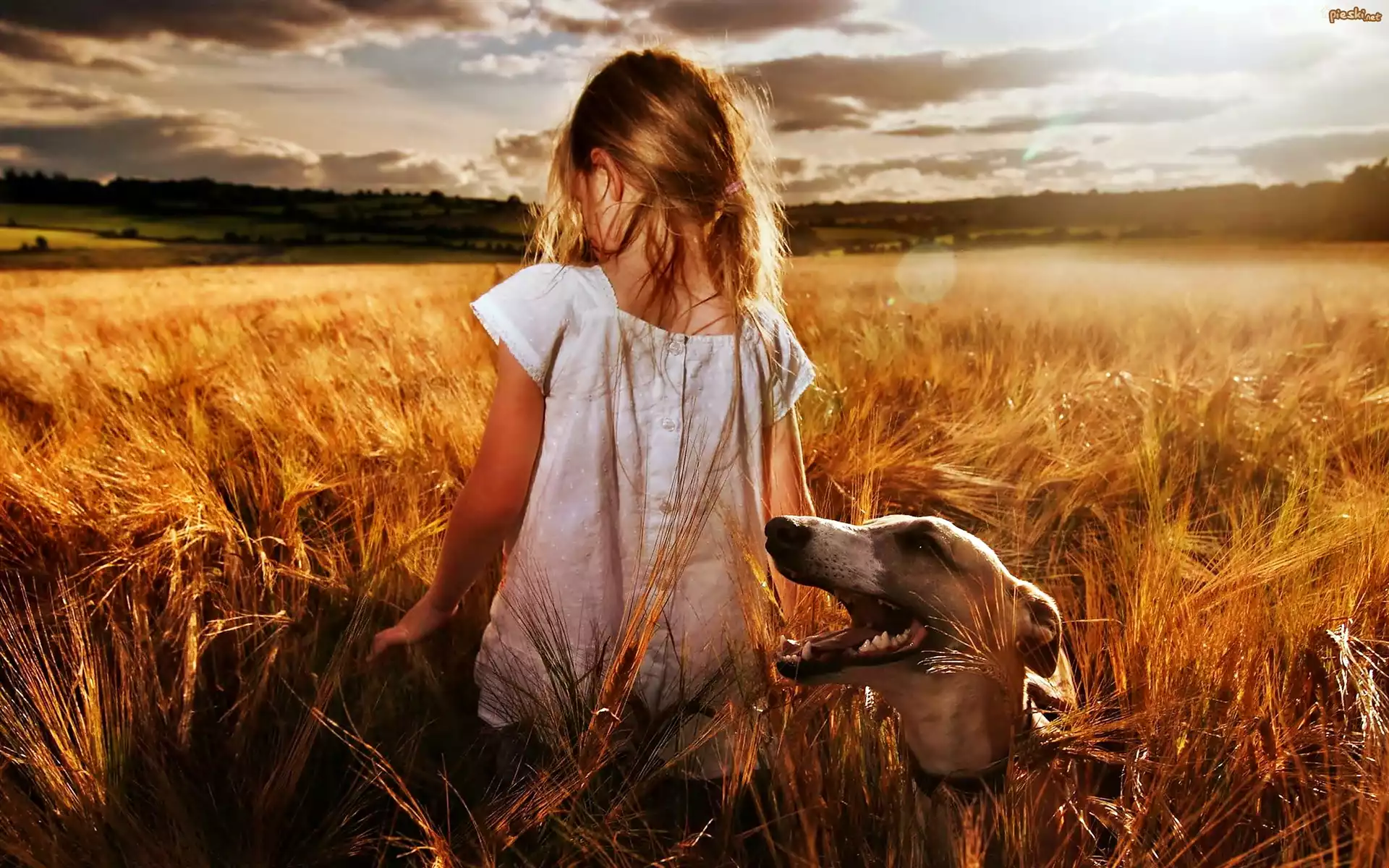 Dziewczynka, Chart, Pole, Chmury, Zachód, Słońca