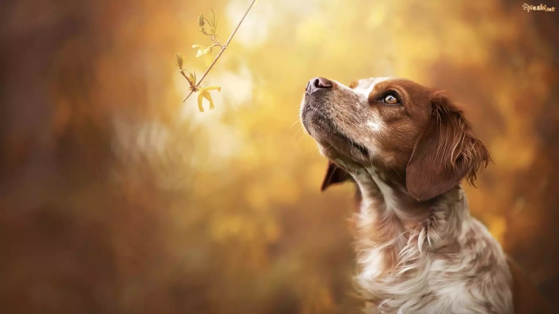 Pies Pies, Epagneul breton, Spaniel bretoński, Rudo-biały, Gałązka