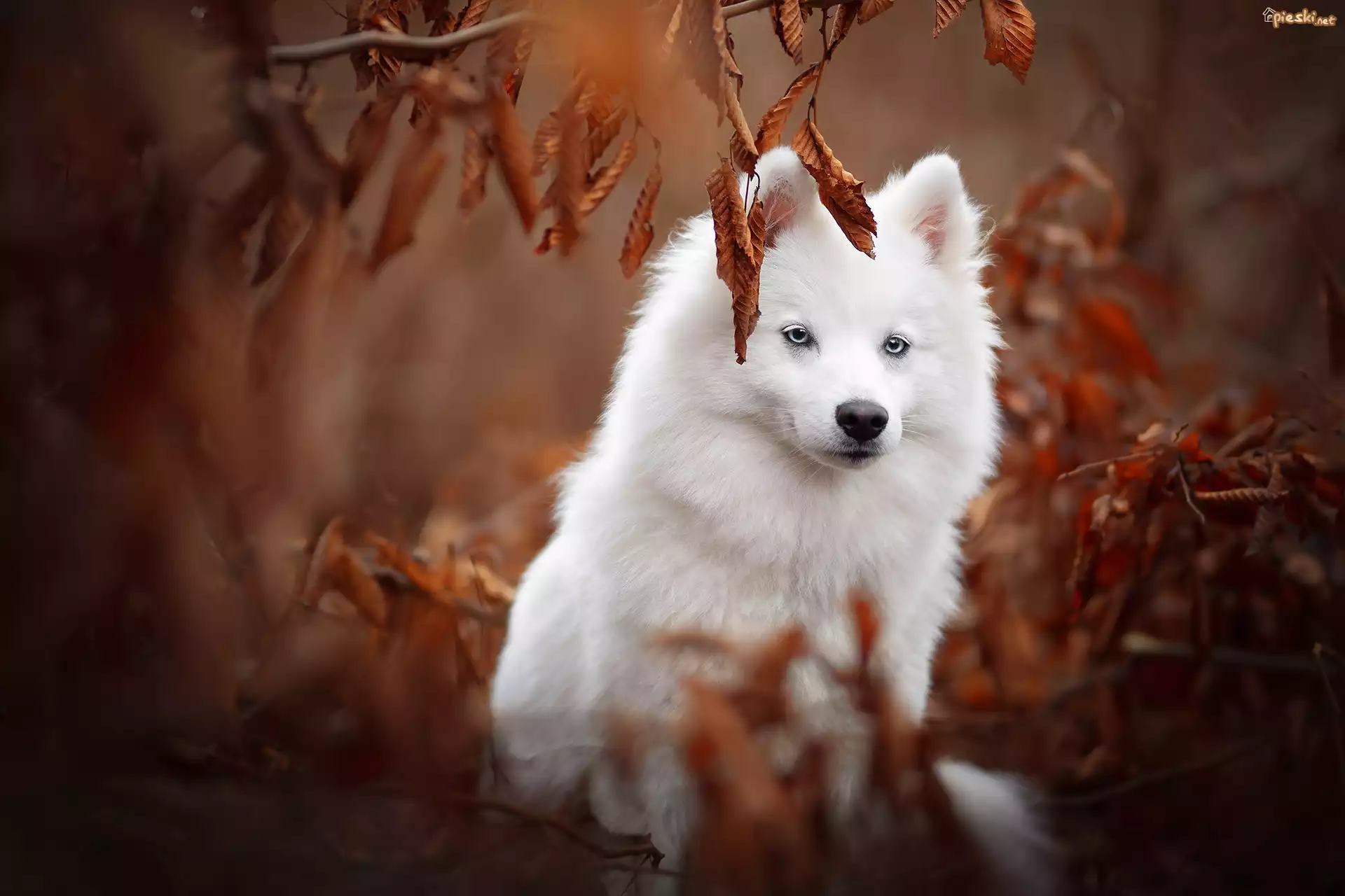 Pies, Niebieskie, Oczy, Amerykański pies eskimoski, American eskimo dog, Liście, Rozmyte tło