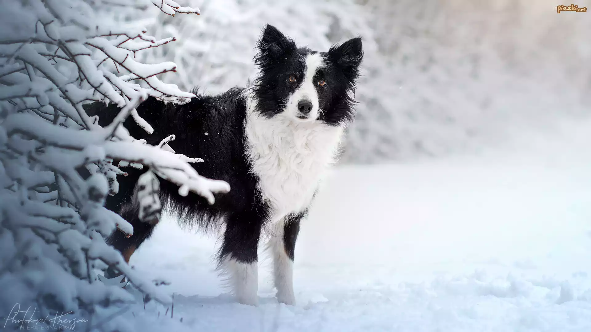 Biało-czarny, Border collie, Pies, Zima, Śnieg, Ośnieżone, Gałązki