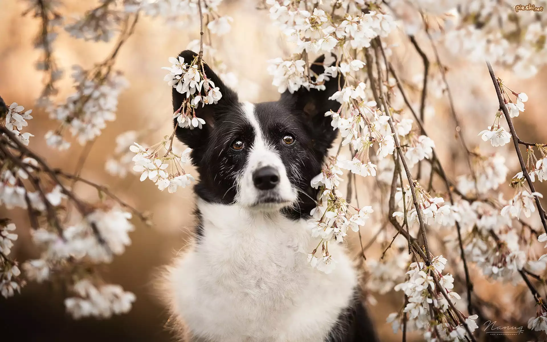 Pies Pies, Border collie, Gałązki, Drzewo owocowe