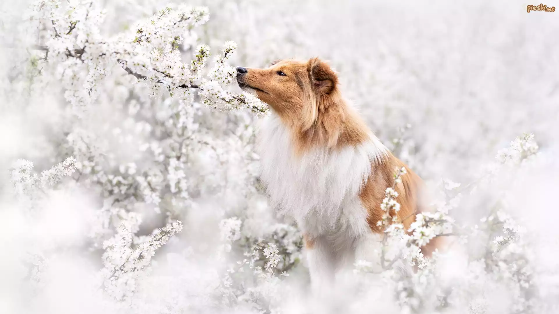 Pies Pies, Owczarek szetlandzki, Gałązki, Drzewo owocowe, Kwiaty