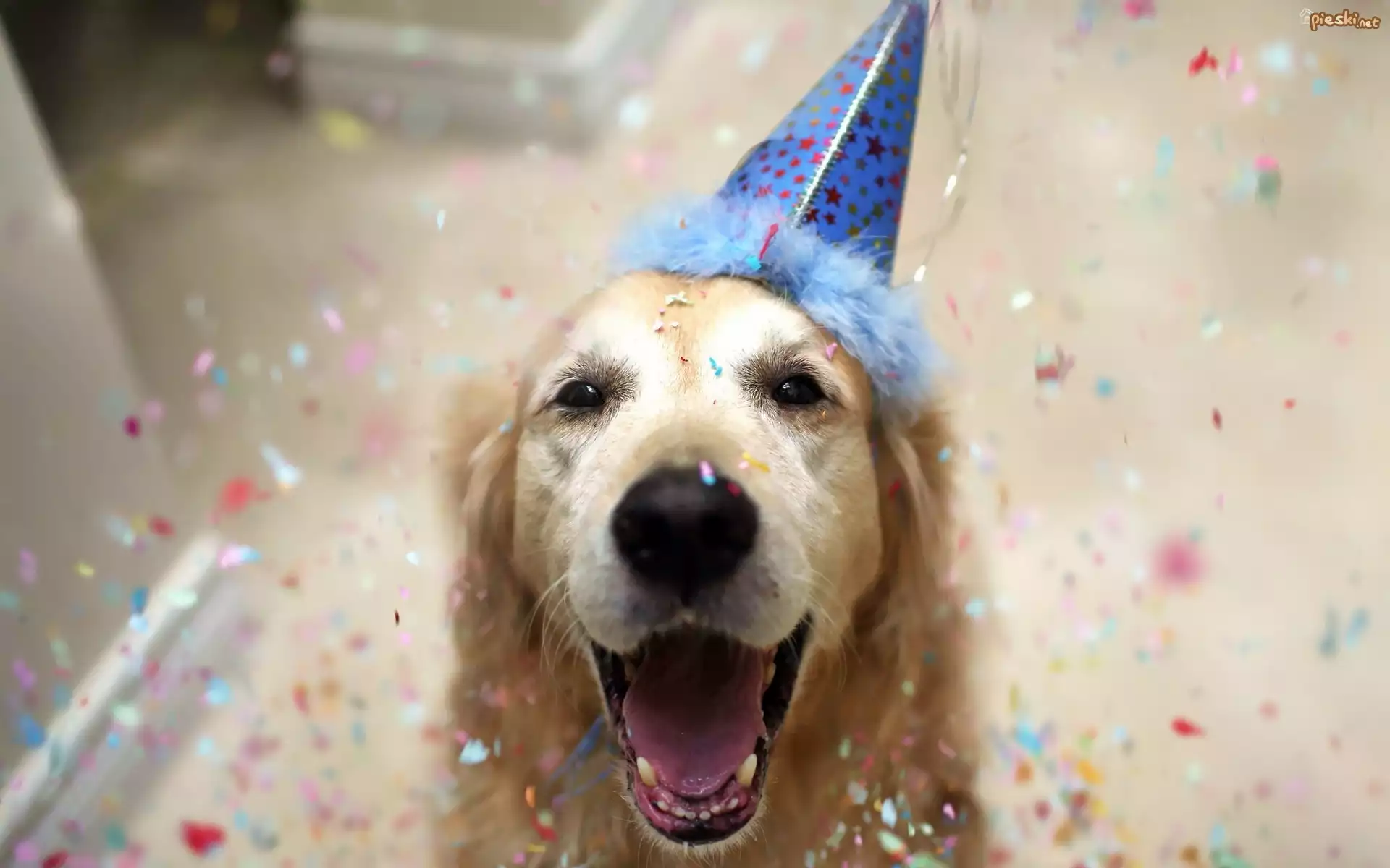 Pies Golden, Retriever, Karnawałowa, Czapeczka, Konfetti