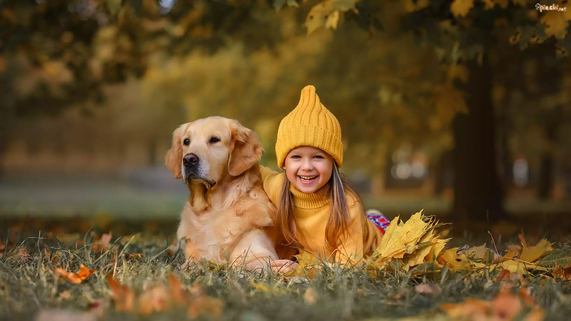 Dziewczyna, Czapka, Pies, Golden retriever, Łąka