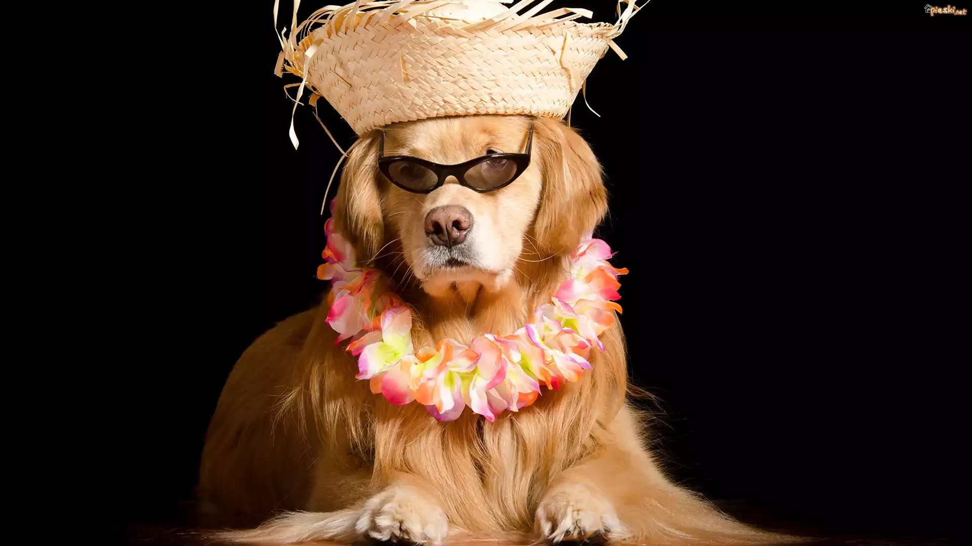Pies Pies, Golden Retriever, Kapelusz, Okulary, Kwiaty, Korale