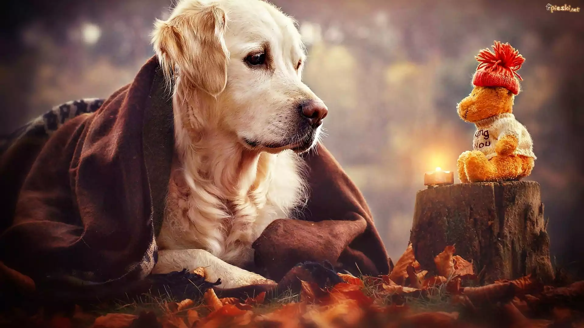 Pies, Golden retriever, Zabawka, Miś, Świeczka, Pień
