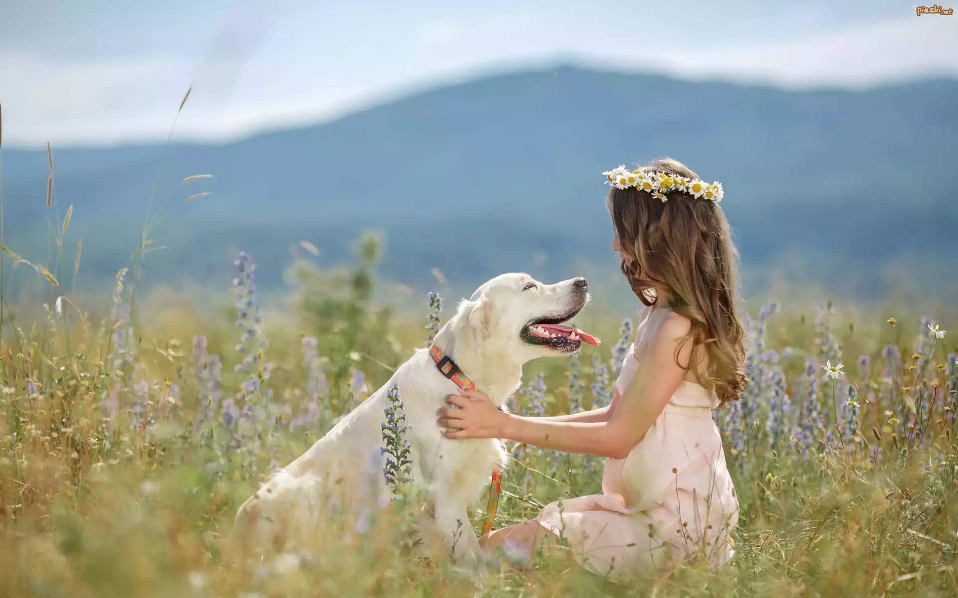 Pies Pies, Golden Retriever, Dziewczynka, Wianek, Łąka, Zabawa