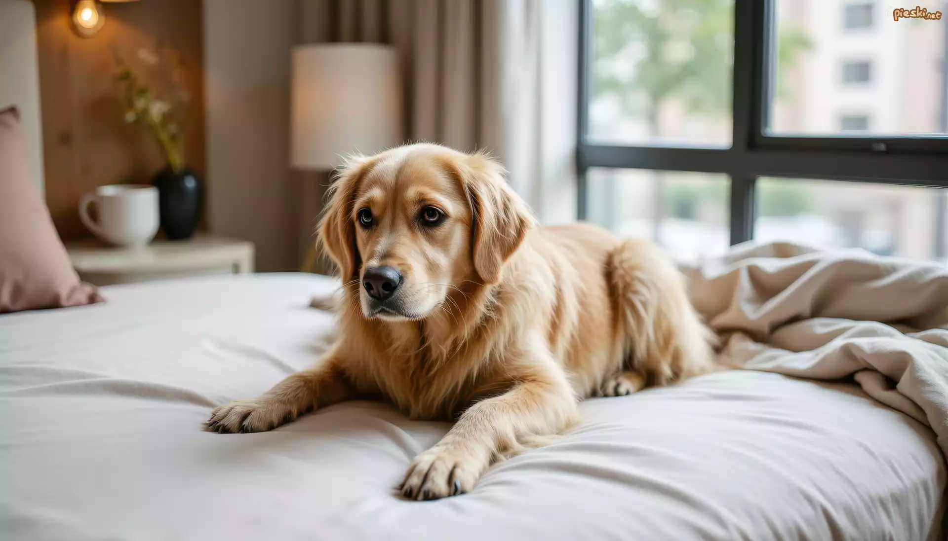 Pies Pies, Golden retriever, Łóżko, Okno