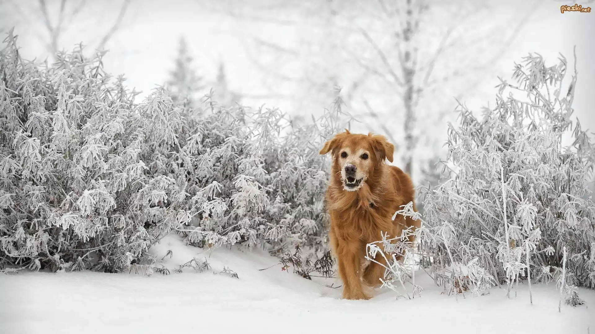 Pies Golden retriever, Zima, Szron, Krzewy