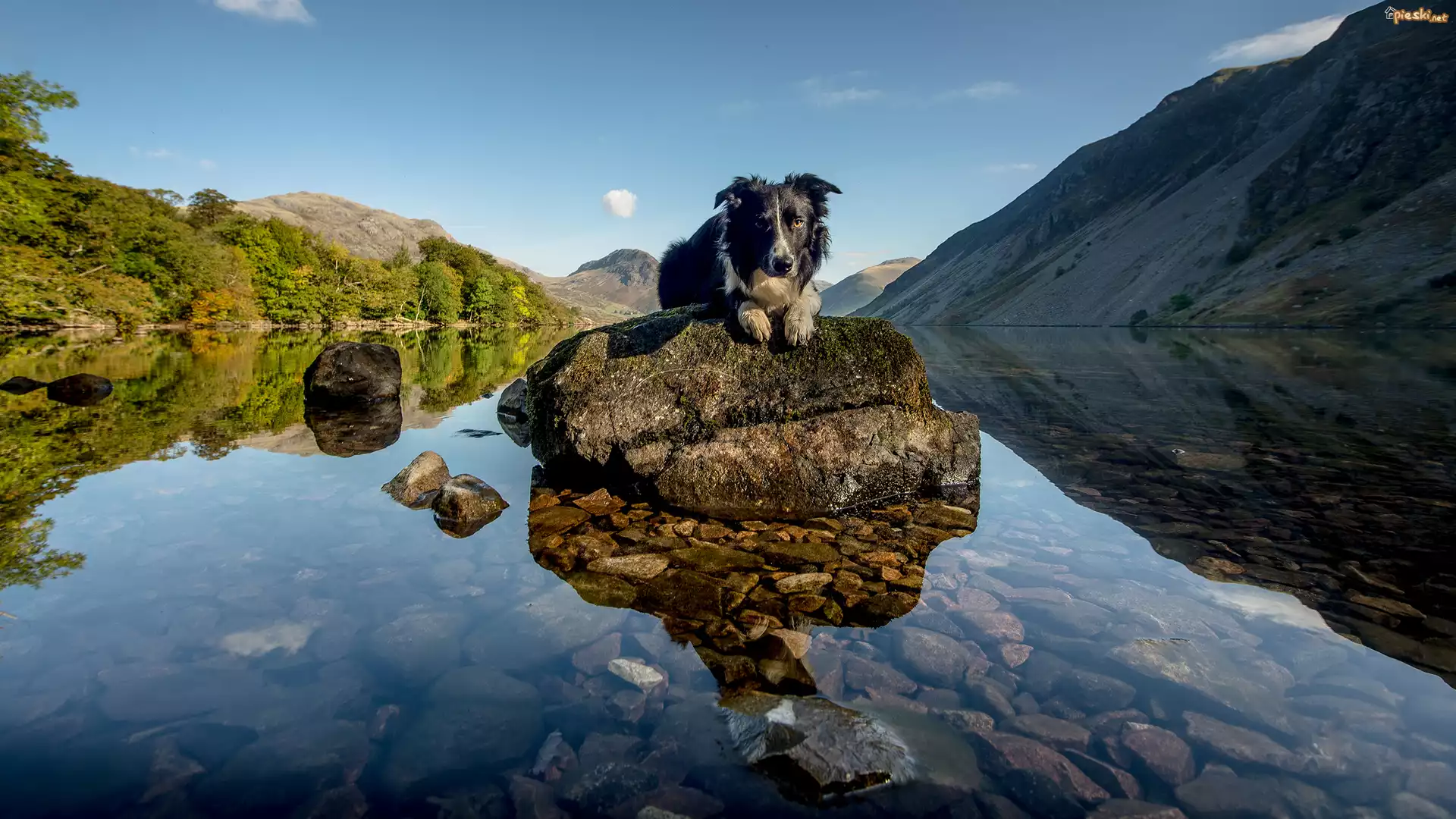 Góry, Woda, Skała, Pies, Border, Collie