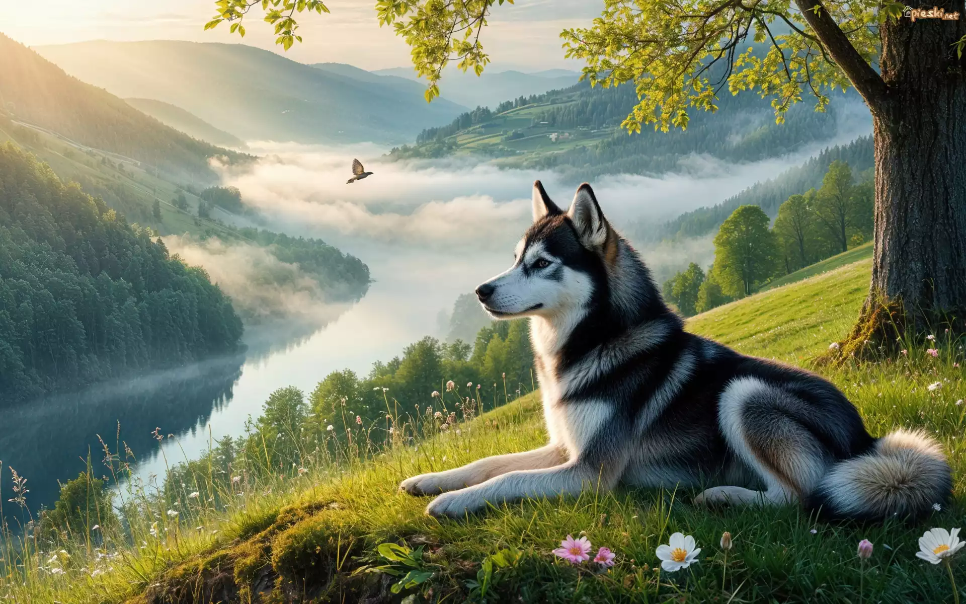 Góry, Wzgórze, Rzeka, Mgła, Drzewo, Polana, Pies, Siberian husky
