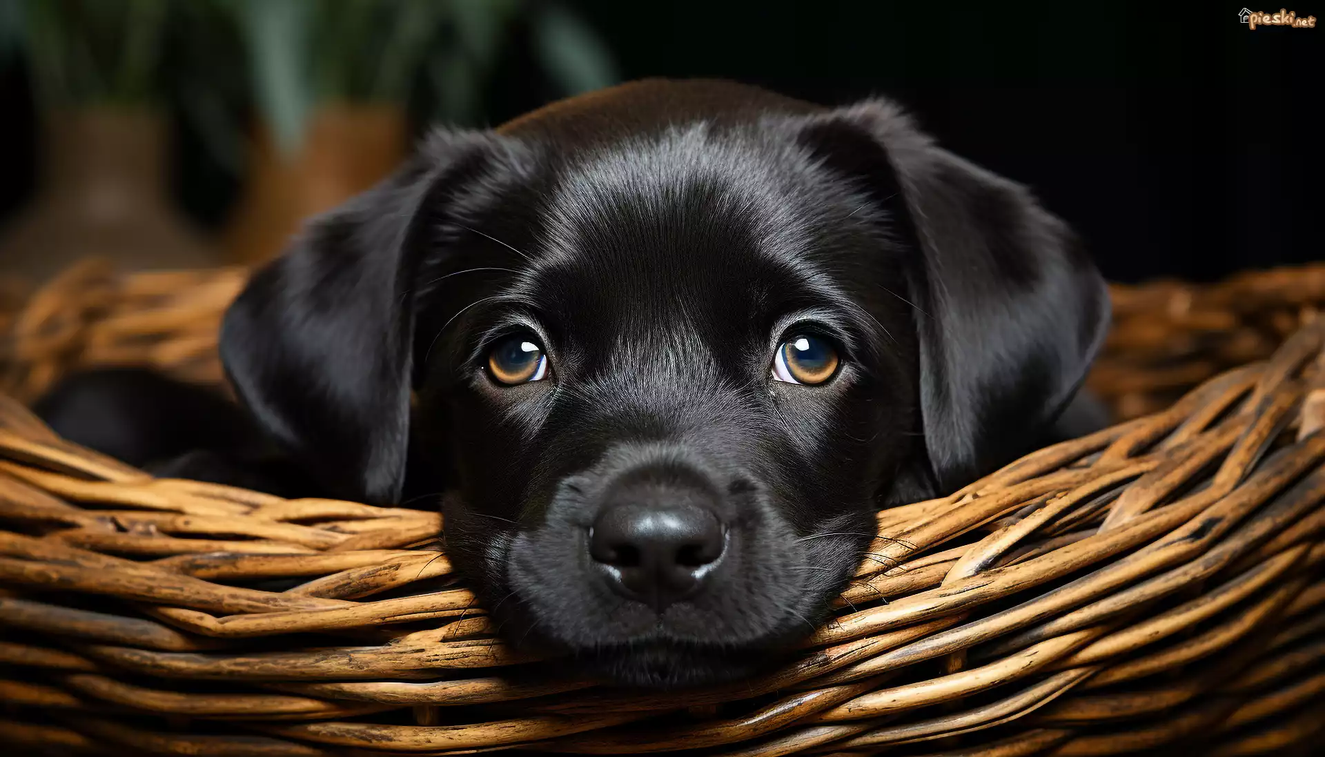 Pies Pies, Czarny, Szczeniak, Mordka, Leżący, Spojrzenie, Koszyk, Grafika