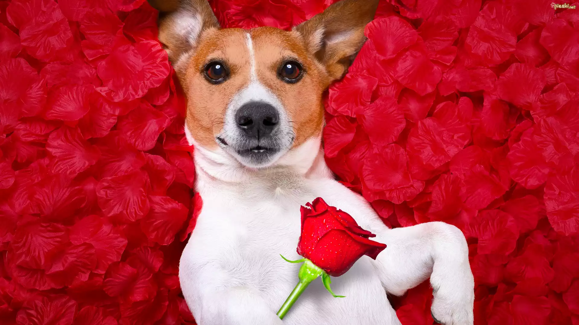 Pies Pies, Jack Russell terrier, Róża, Czerwone, Płatki