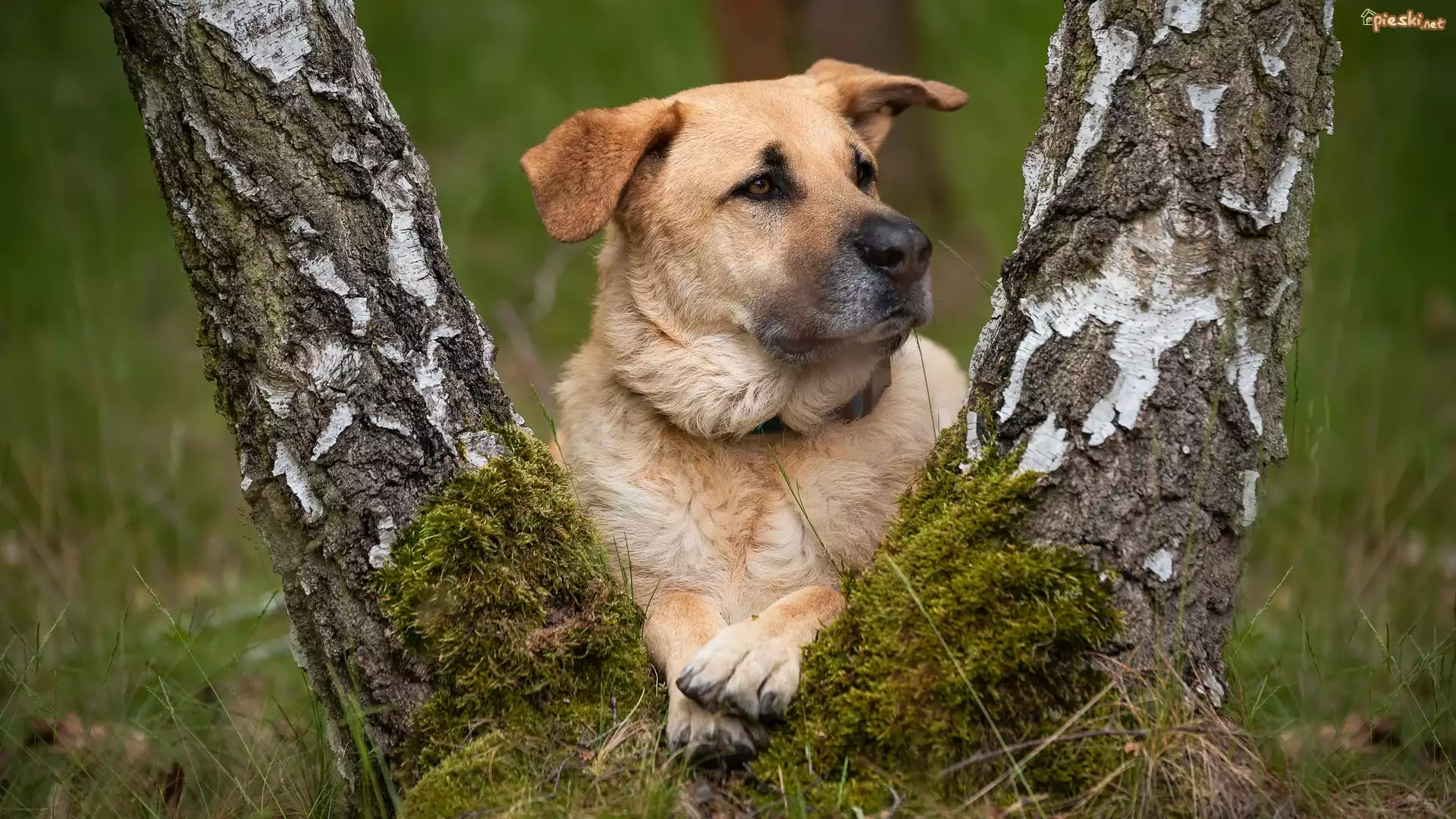 Pies Jasnobrązowy, Pies, Drzewo, Brzoza, Mech