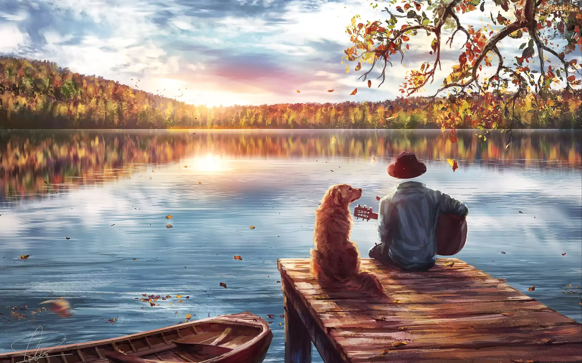 Pies Jesień, Jezioro, Pomost, Pies, Postać, Gitara, Łódź, Grafika