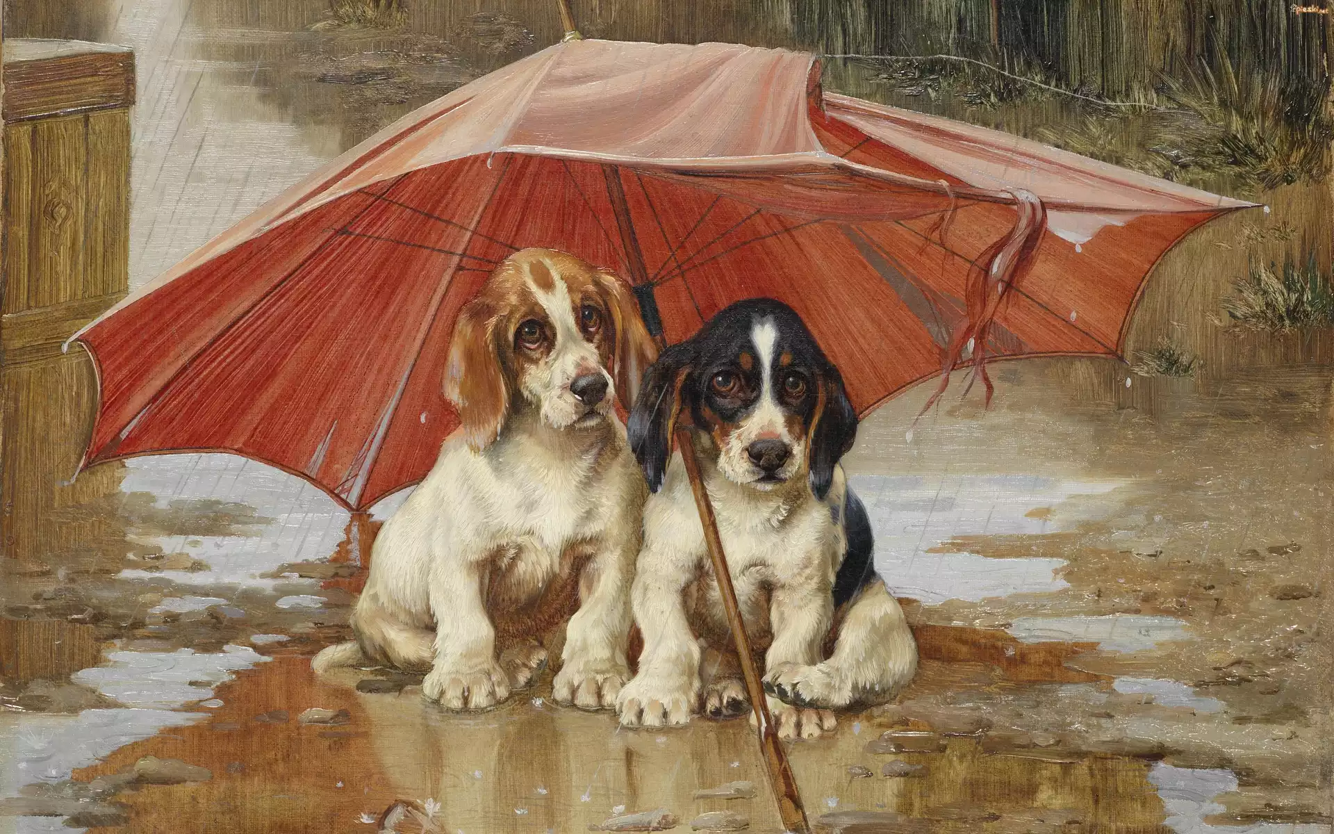 Pies Malarstwo, Obraz, Wiliam Henry Hamilton Trood, Psy, Deszcz, Parasol, Kałuża