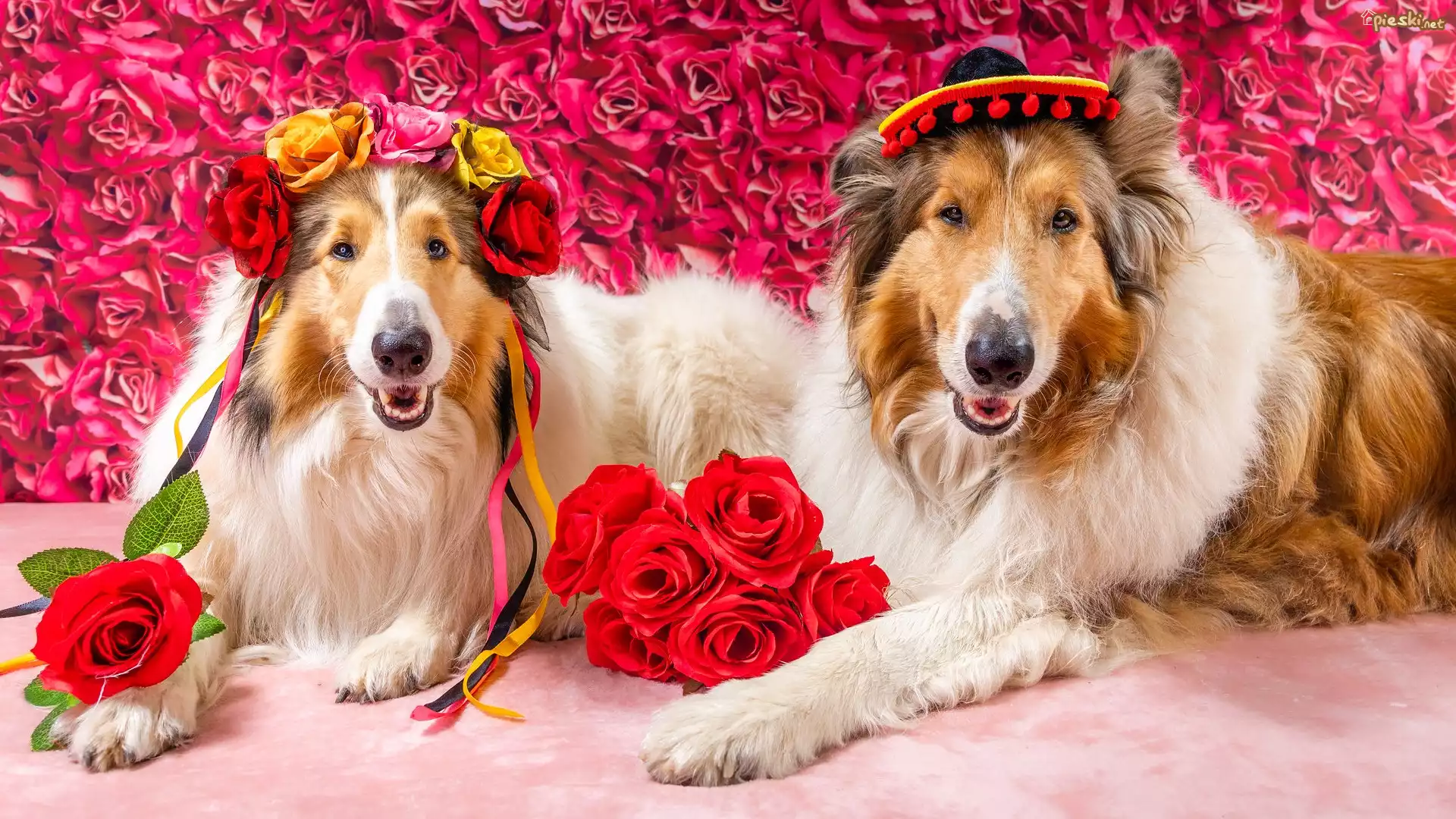 Dwa, Psy, Owczarki szkockie długowłose, Róże, Wianek, Kapelusz