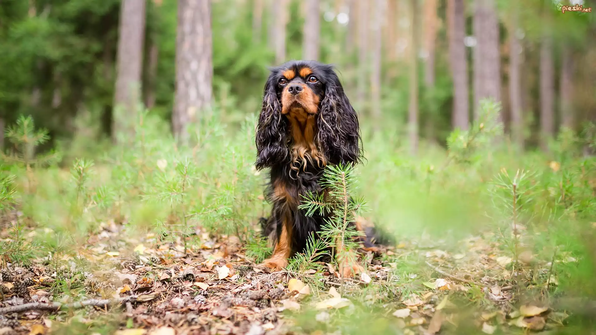 Pies Pies, King Charles spaniel, Las, Drzewa, Ściółka