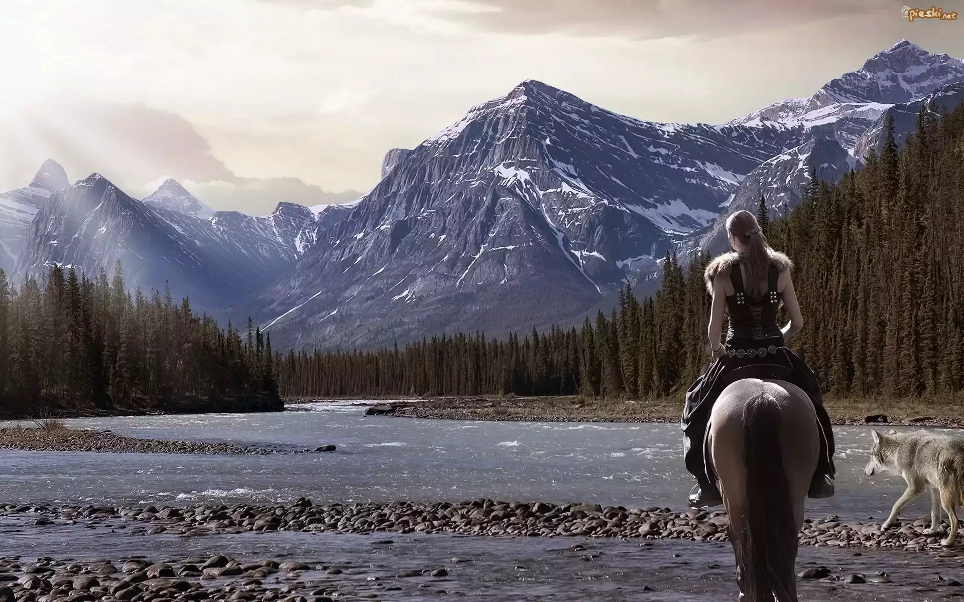 Kobieta, Koń, Pies, Rzeka, Góry, Lasy