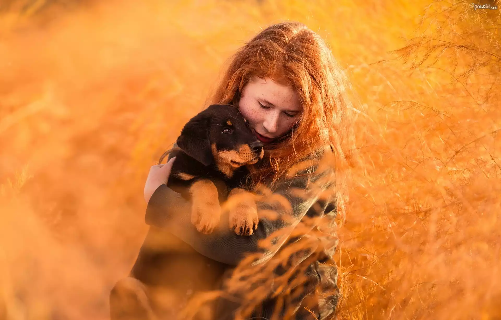Pies Kobieta, Rudowłosa, Szczeniak, Rottweiler, Trawy