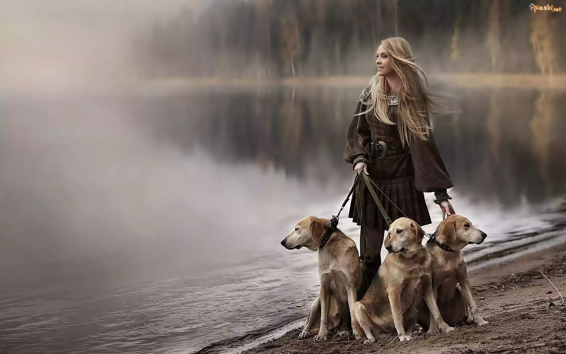 Pies Kobieta, Blondynka, Psy, Rzeka, Las