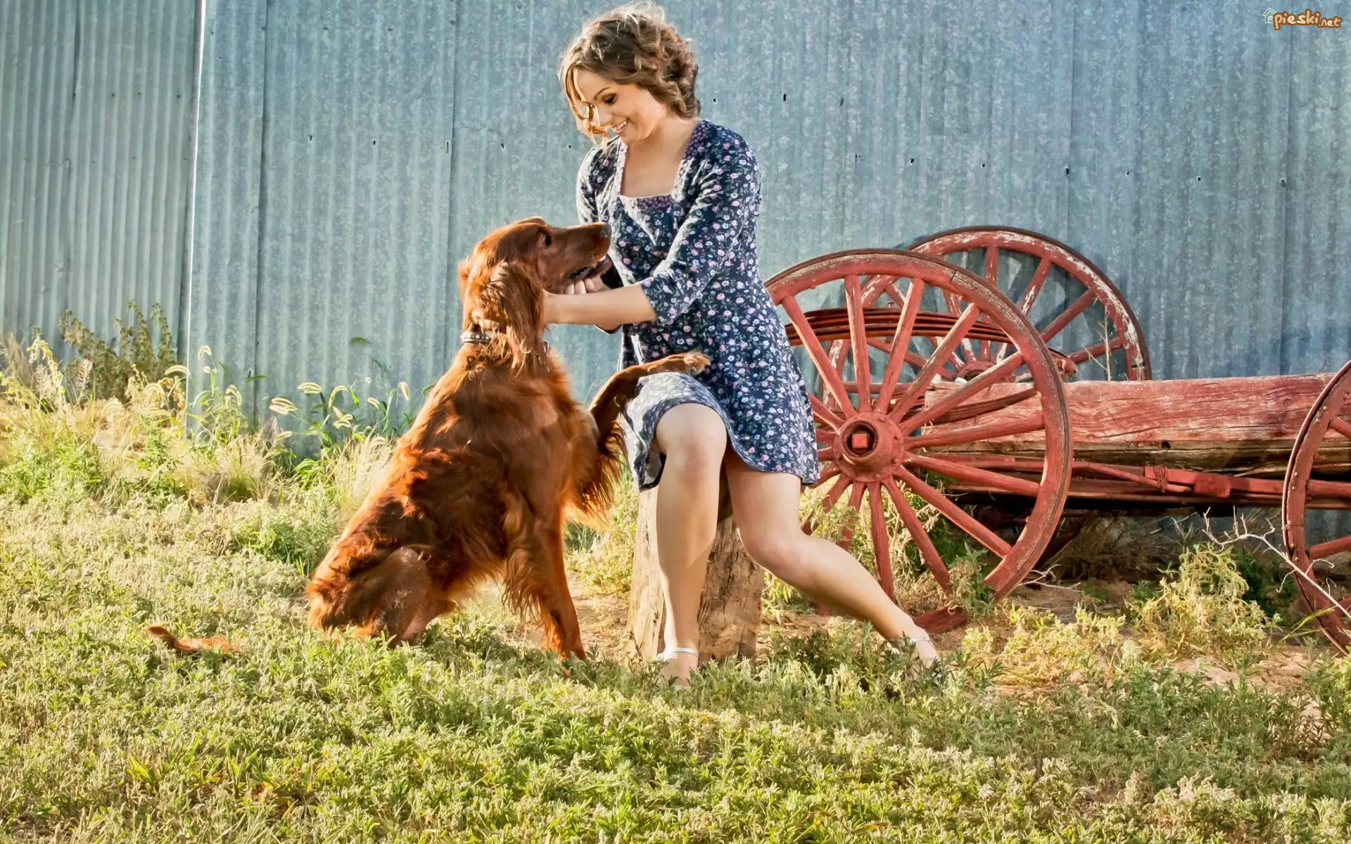 Pies Kobieta, Pies, Wieś, Lato, Seter irlandzki