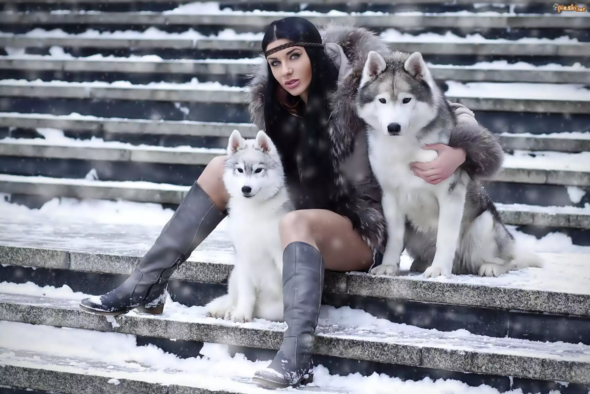 Kobieta, Dwa, Pieski, Siberian Husky