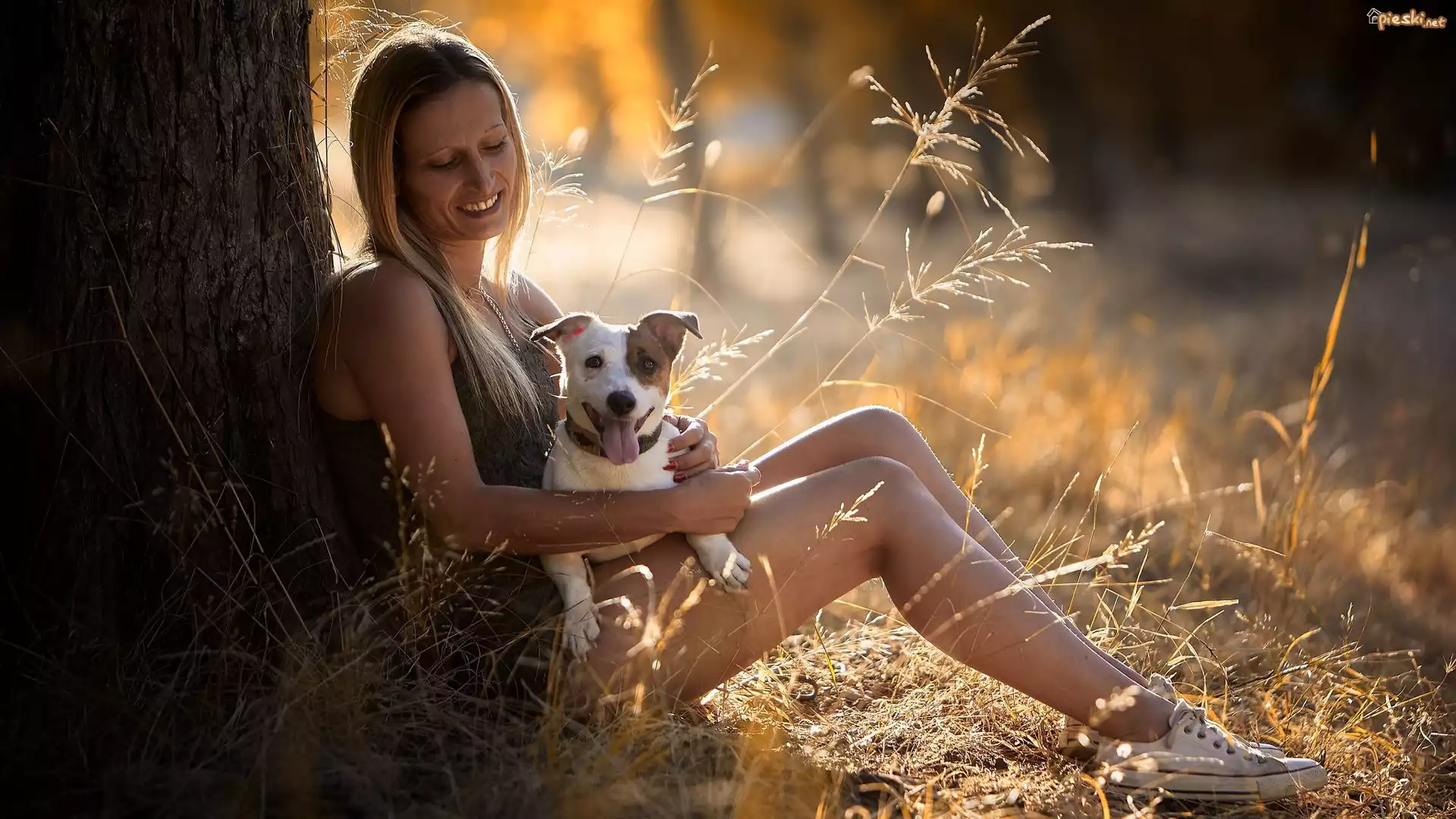 Pies Kobieta, Pies, Drzewo, Trawa, Słońce