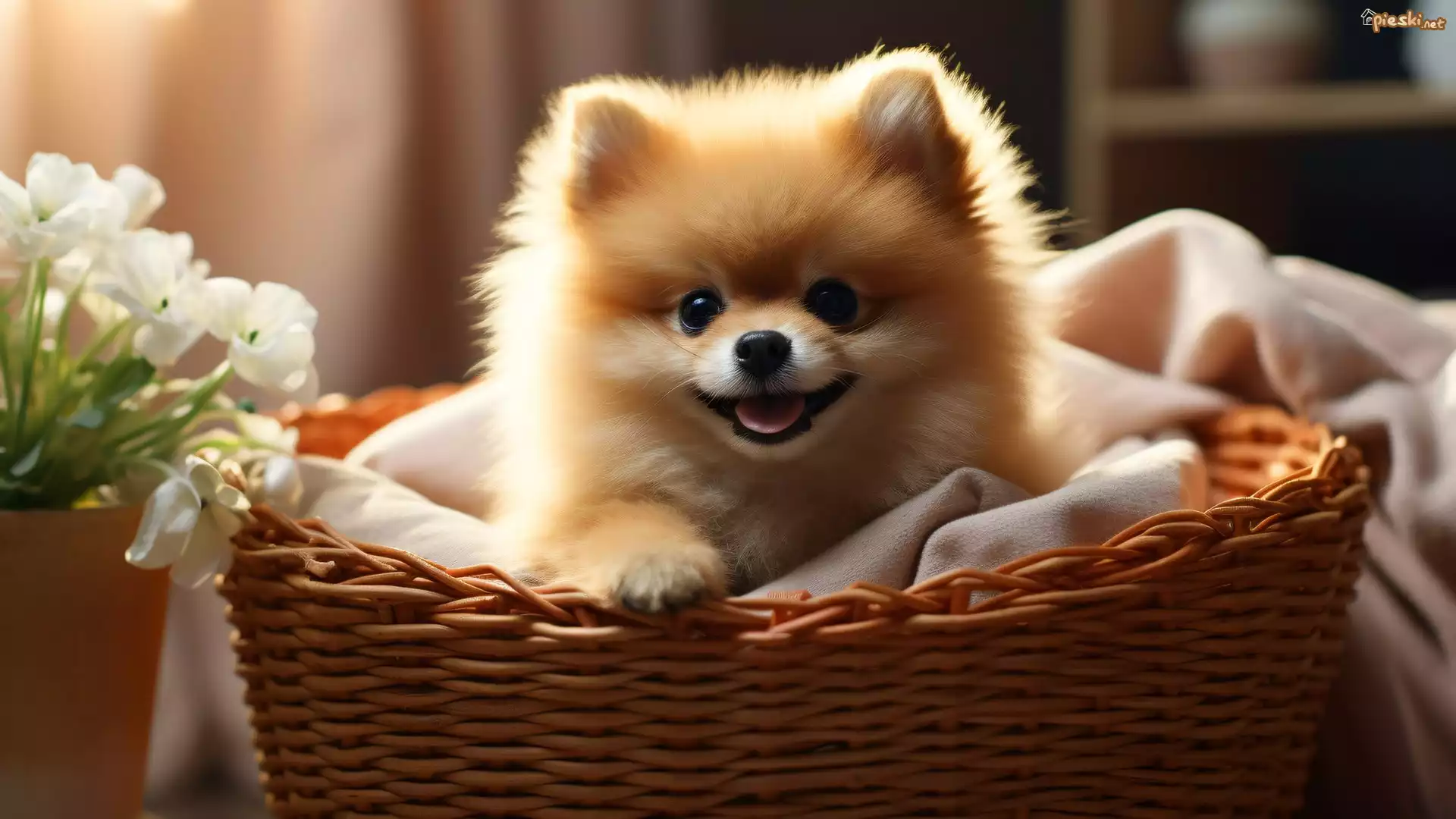 Pies Pies, Szpic miniaturowy, Kosz, Koc, Białe, Kwiaty