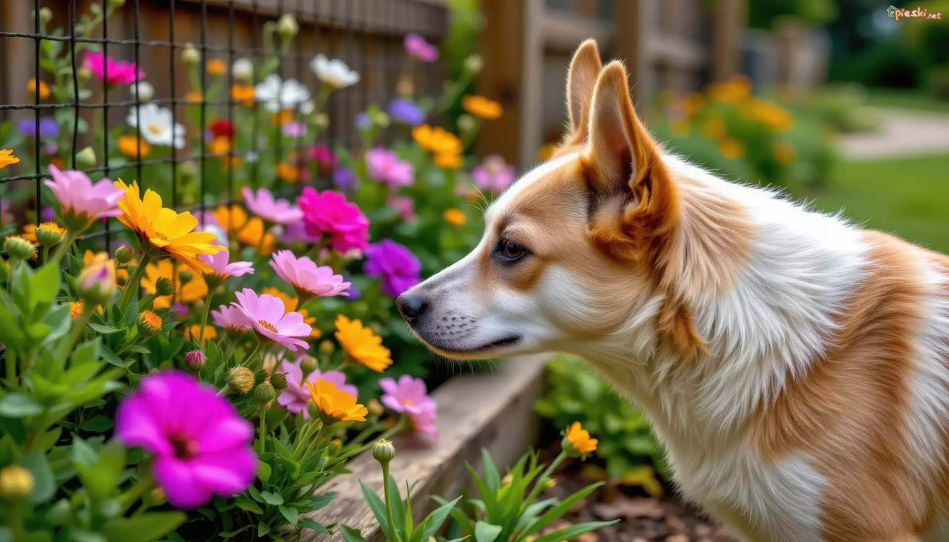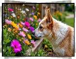 Pies Biało-beżowy, Pies, Kwiaty, Kolorowe, Ogrodzenie