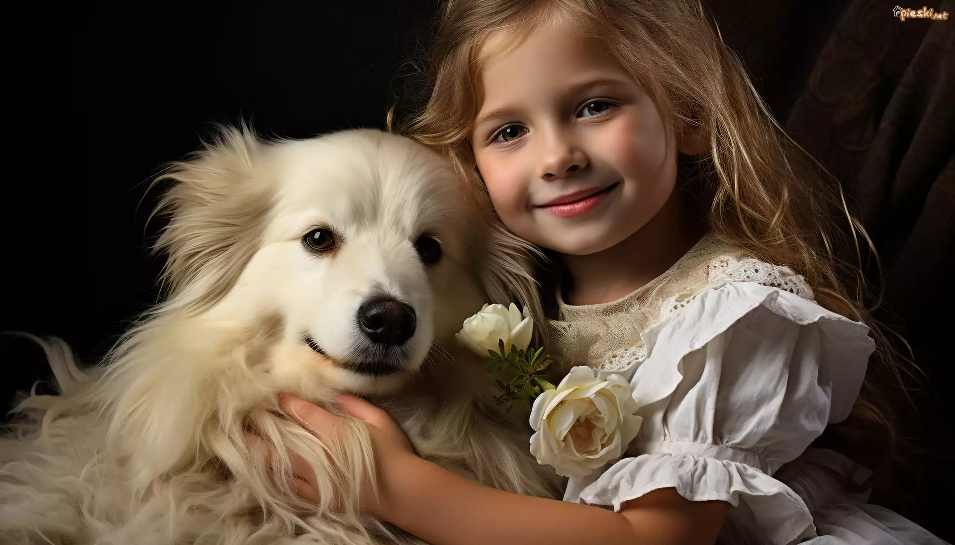 Dziewczynka, Biała, Sukienka, Kwiaty, Biały, Pies