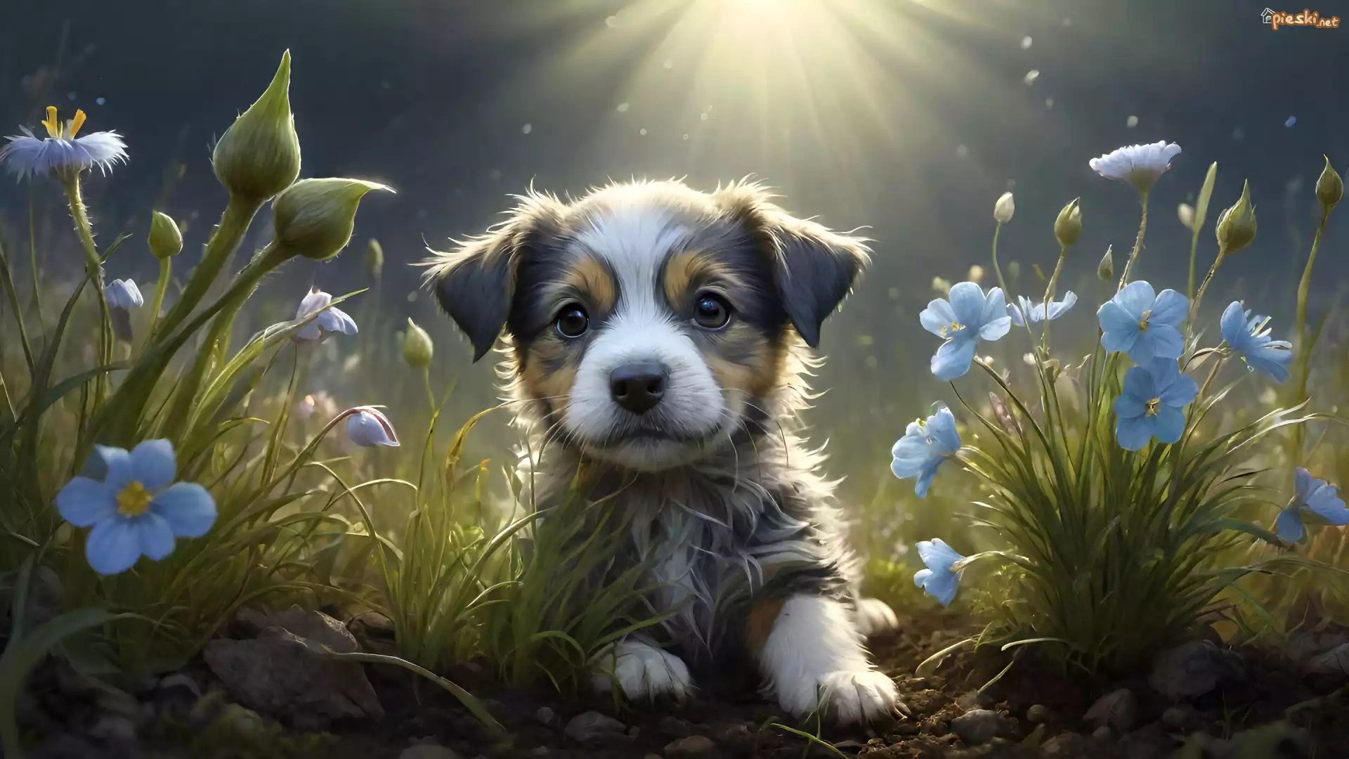 Pies, Szczeniak, Spojrzenie, Kwiaty, Niebieskie, Pąki, Grafika