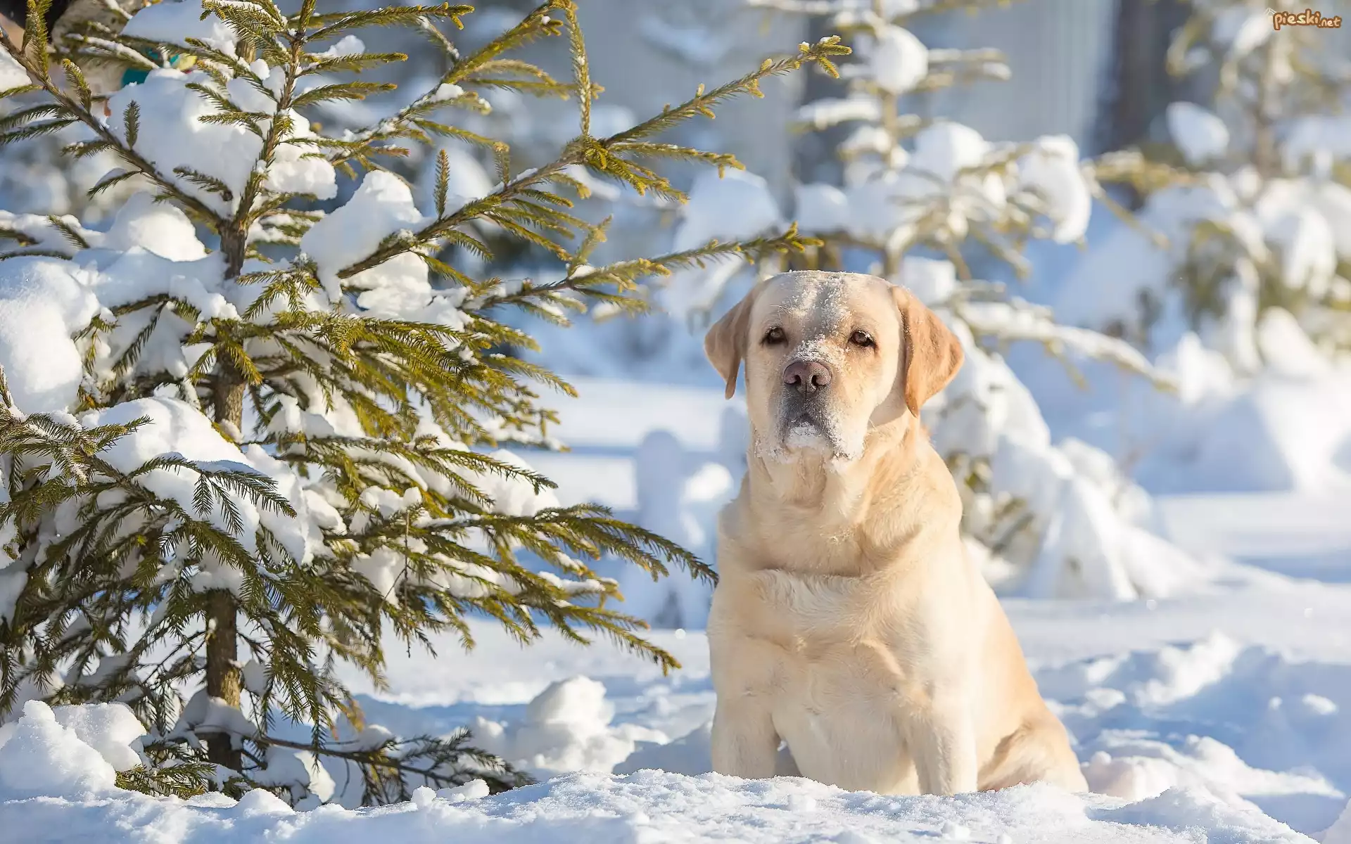Pies Labrador, Retriever, Śnieg, Zima, Iglaki