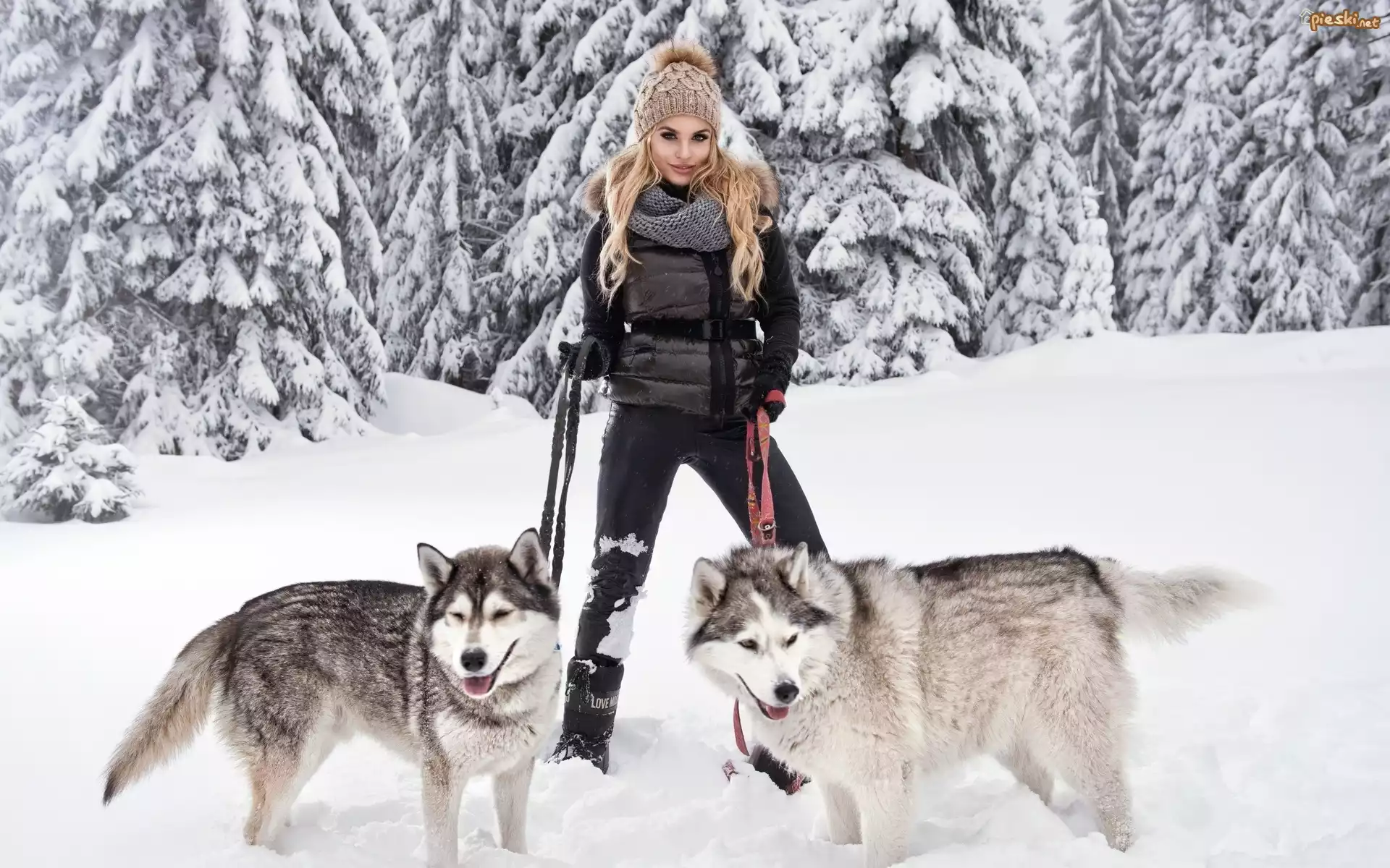 Zima, Las, Dziewczyna, Spacer, Psy, Siberian Husky