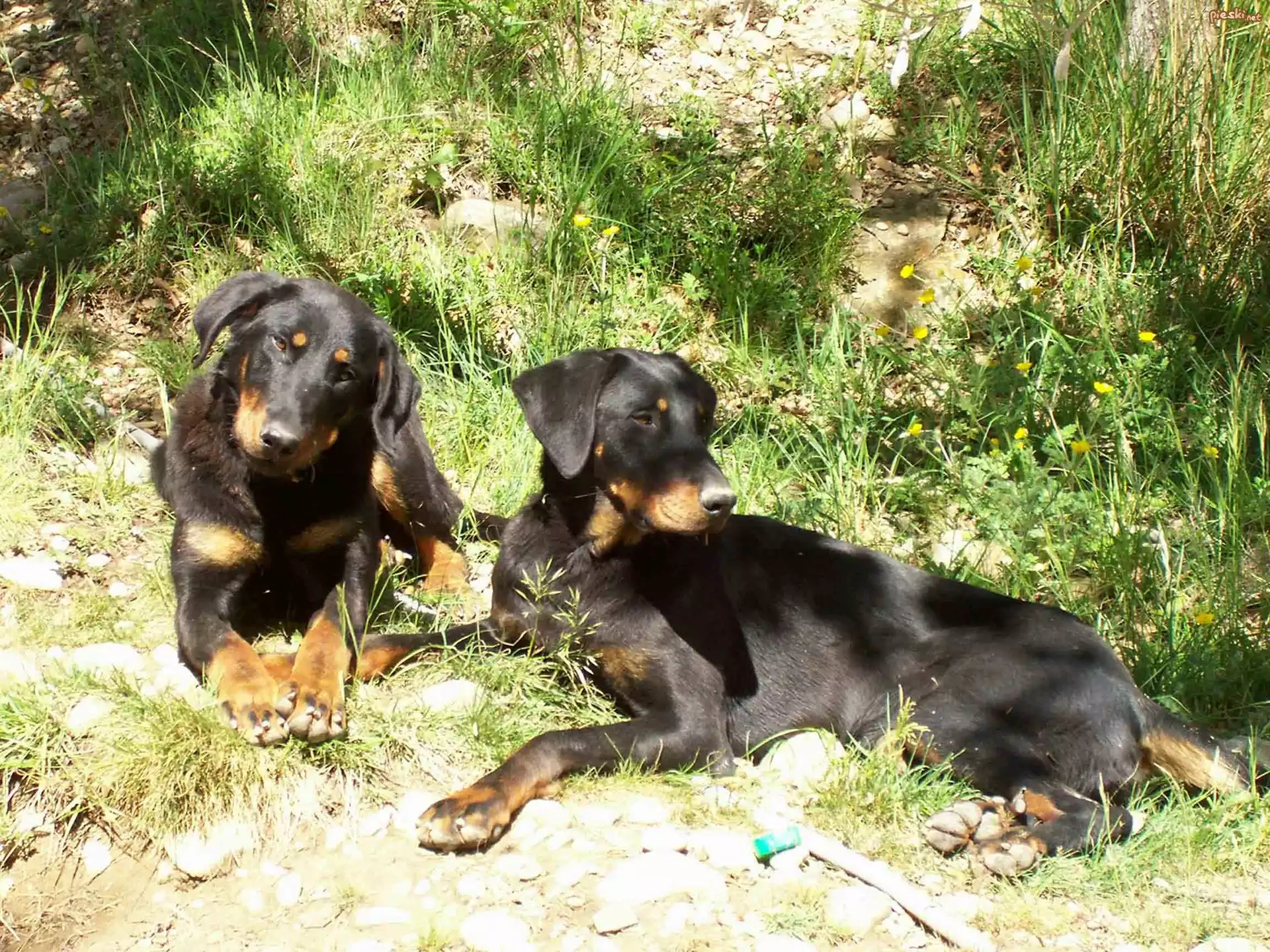 Dwa, Owczarki francuskie Beauceron Dwa, małe, Beaucerony Duży, piękny, Beauceron Młody, Owczarek francuski Beauceron, ogród Beauceron Owczarek francuski Beauceron, woda Owczarek francuski Beauceron, brązowe, oczy Owczarek francuski Beauceron, kamienie Trzy, Beaucerony, przewrócone, drzewo Głowa, Owczarka francuskiego Beaucerona Dwa, młode, Owczarki francuskie Beaucerony Dwa, Szczeniaki, Owczarki francuskie Beauceron, Trawa Beauceron, łapy Szczeniaki, Owczarka francuskiego Beaucerona