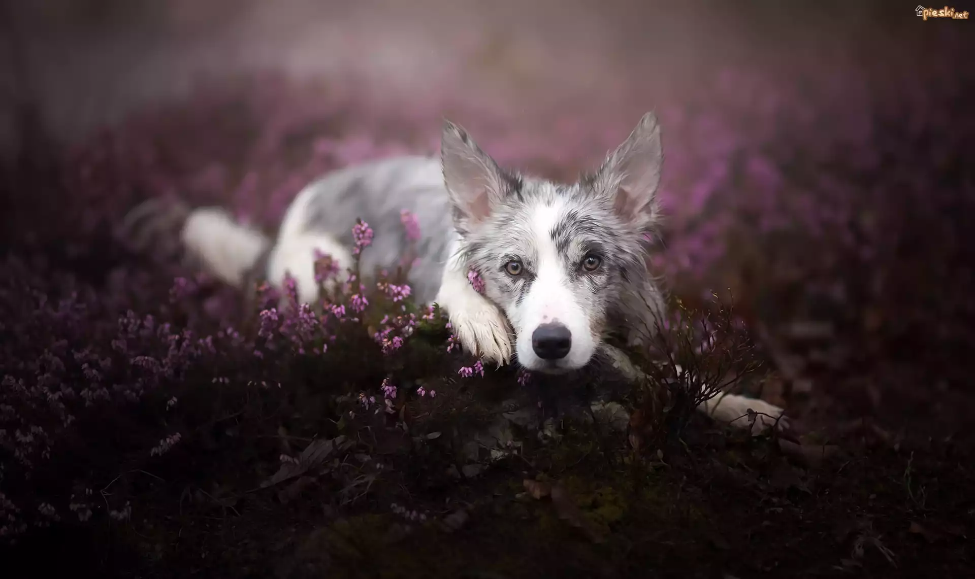 Pies Leżący, Border collie, Wrzos