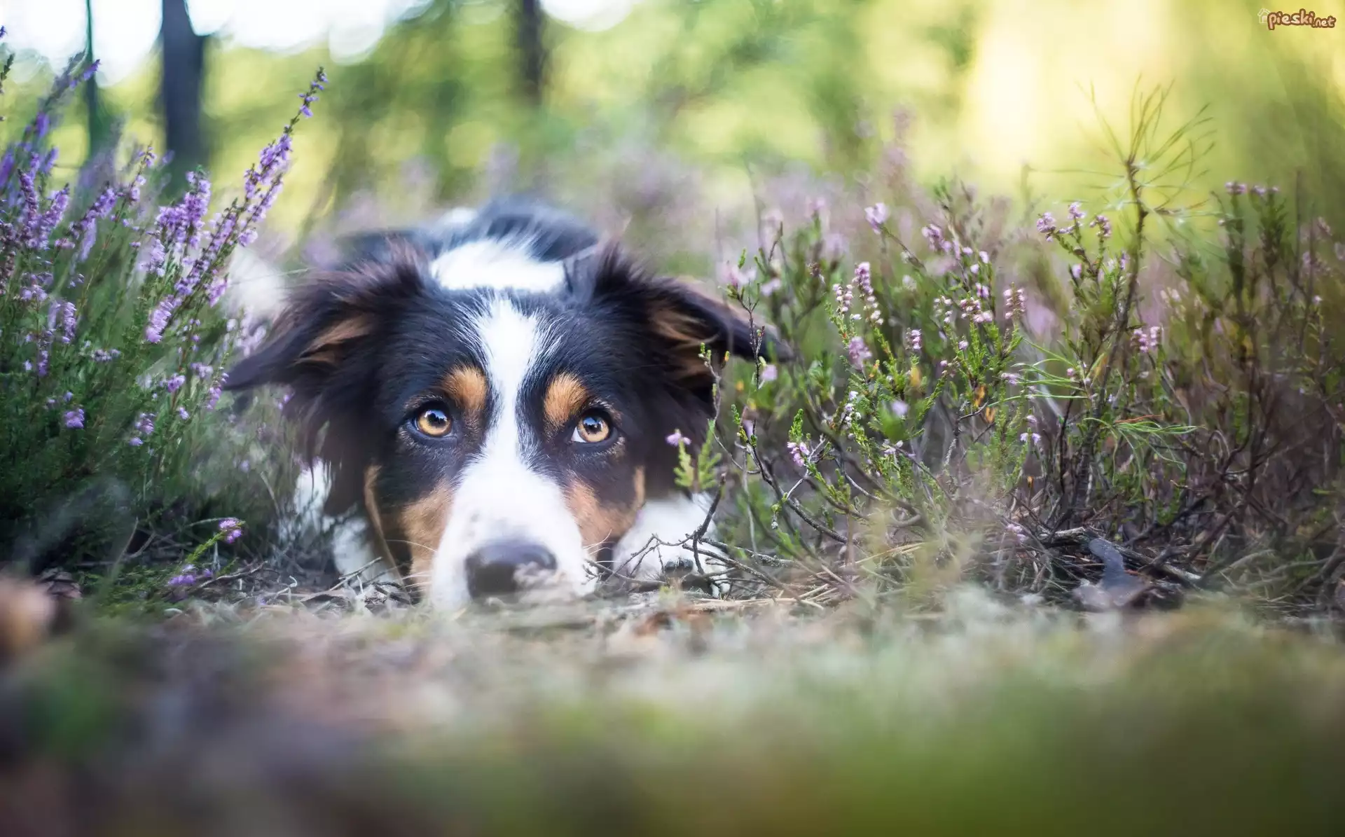 Pies Leżący, Border Collie, Mordka, Wrzos