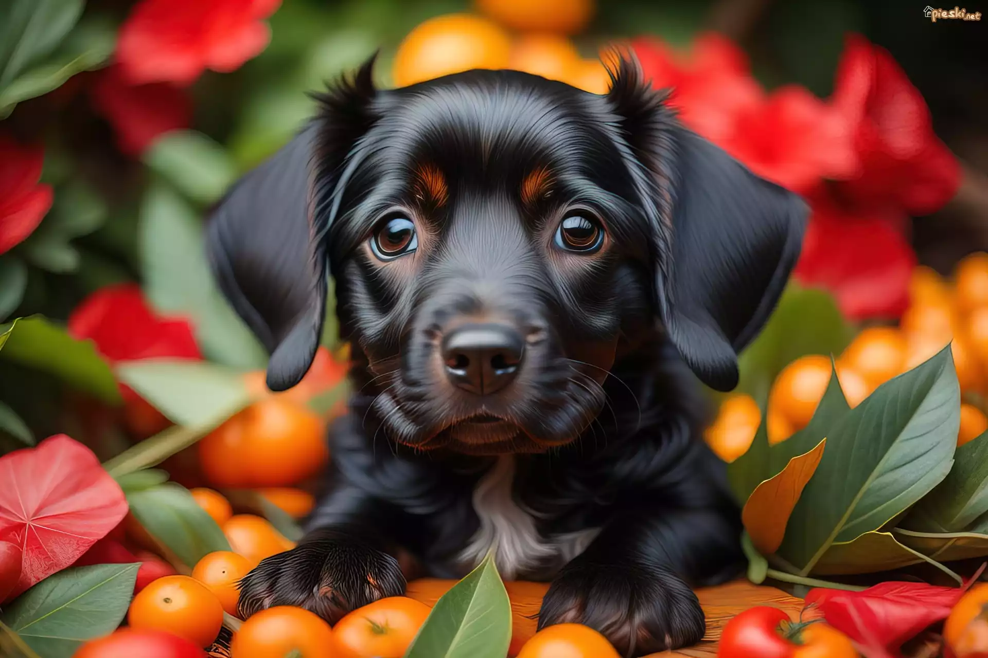 Pies Czarny, Pies, Kwiaty, Listki