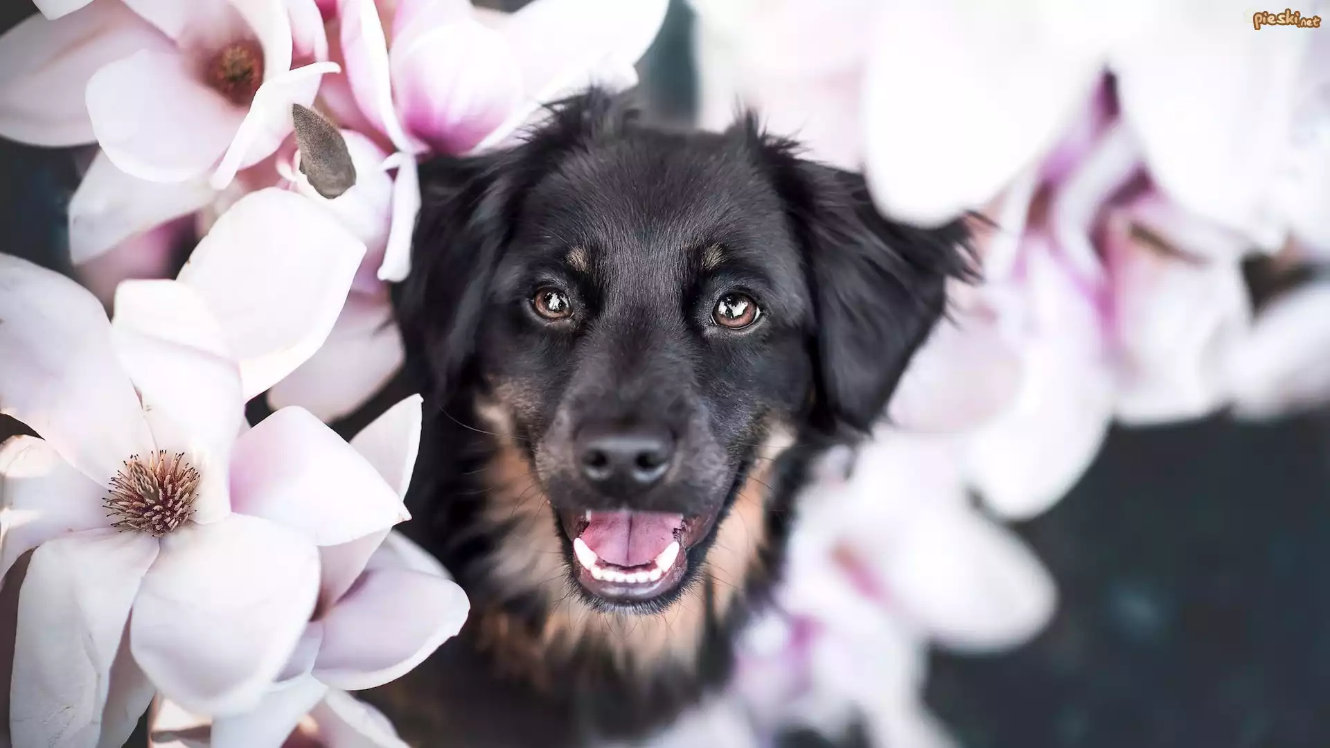 Pies Pies, Czarny, Kwiaty, Magnolie