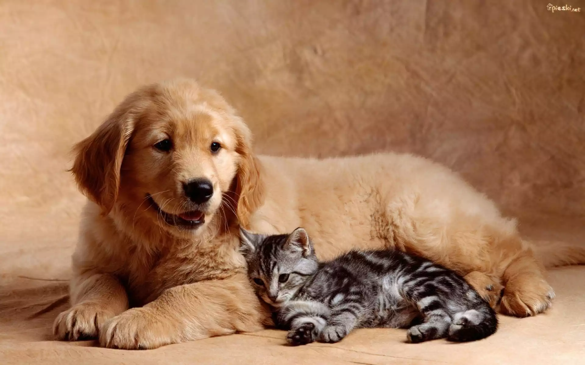 Pies Mały, Szczeniak, Golden Retriever, Kotek