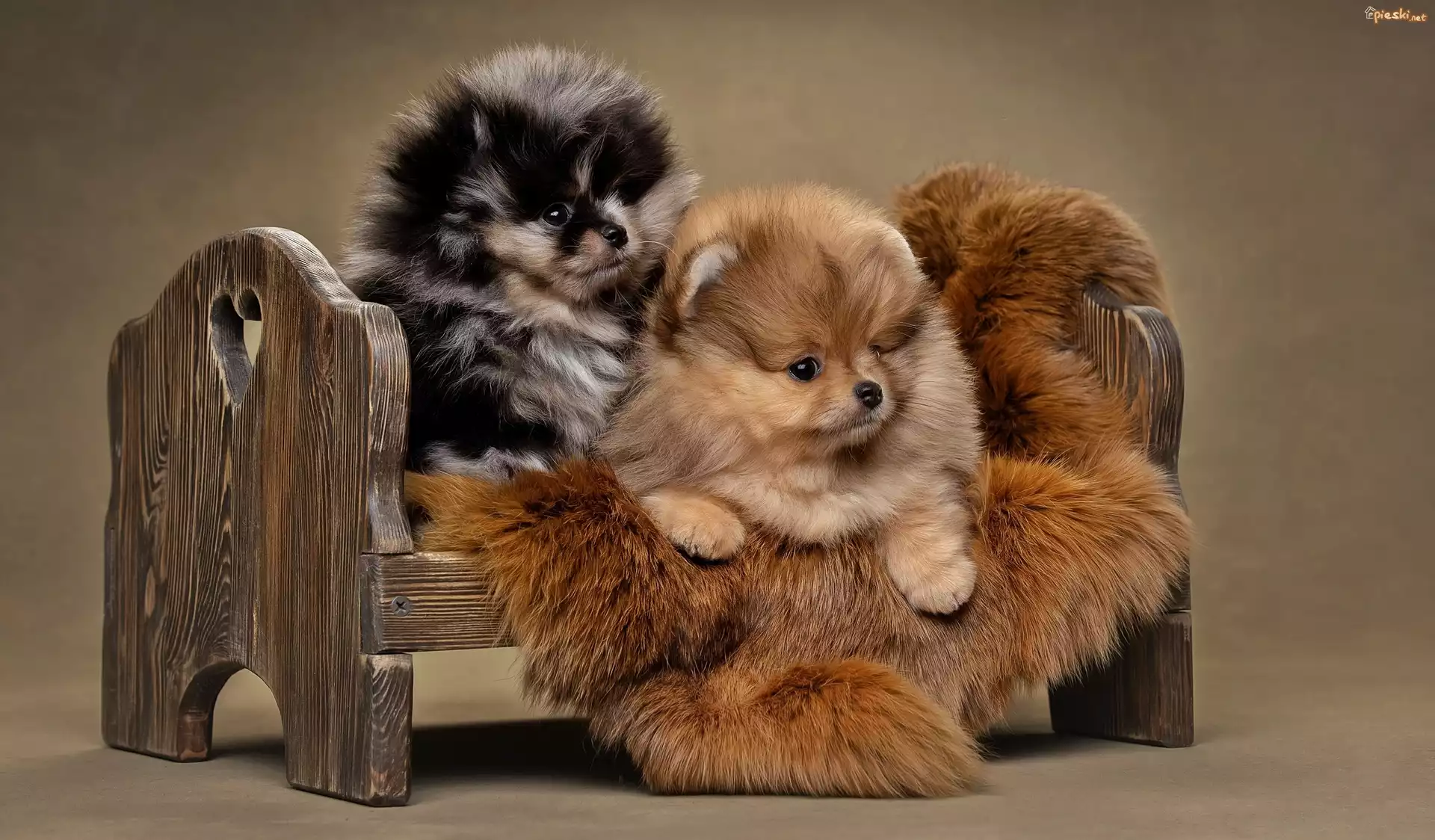 Dwa, Psy, Szpie miniaturowe, Ławka, Futro