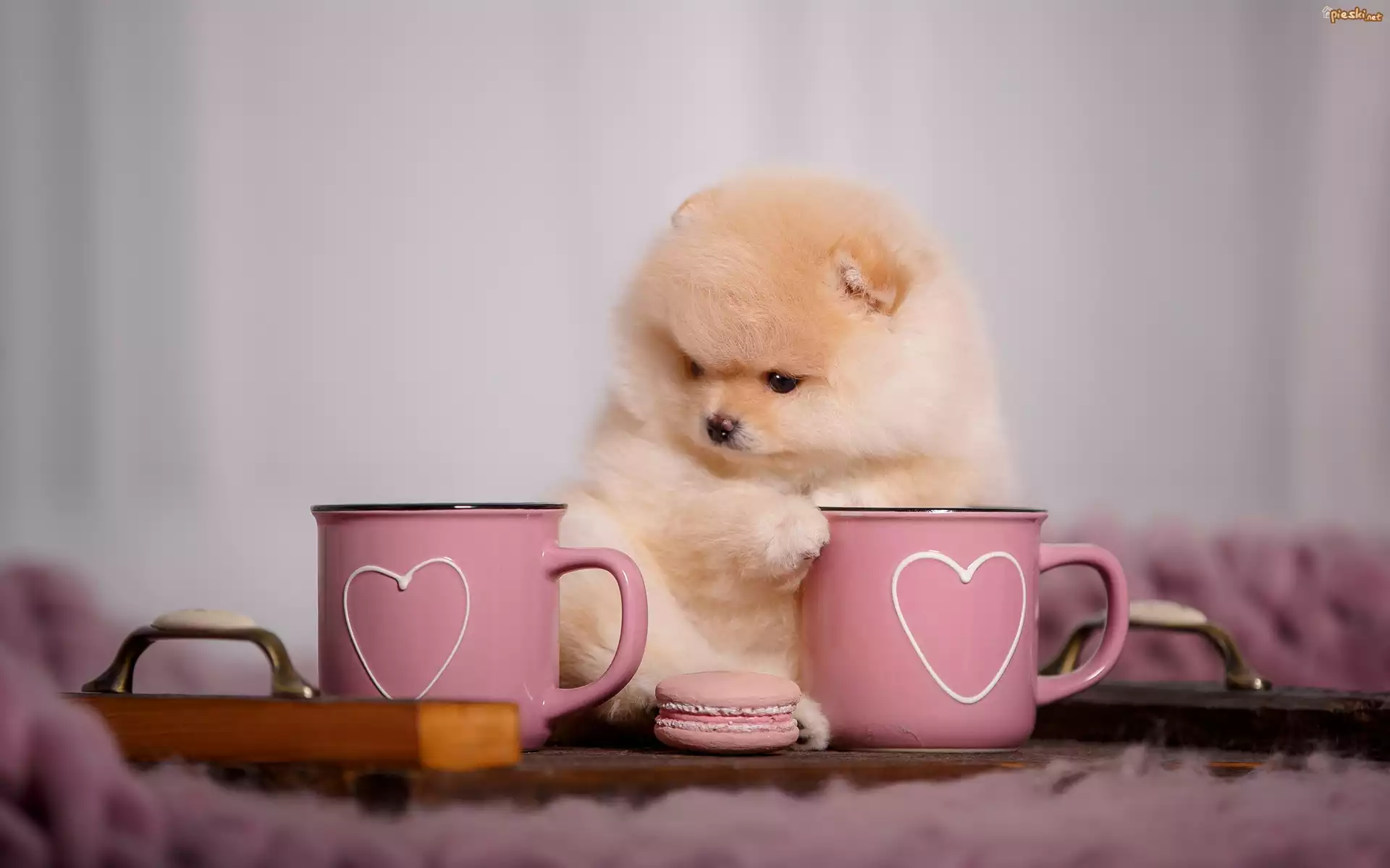 Szpic miniaturowy, Szczeniak, Pies, Różowe, Kubki, Ciasteczko, Makaronik