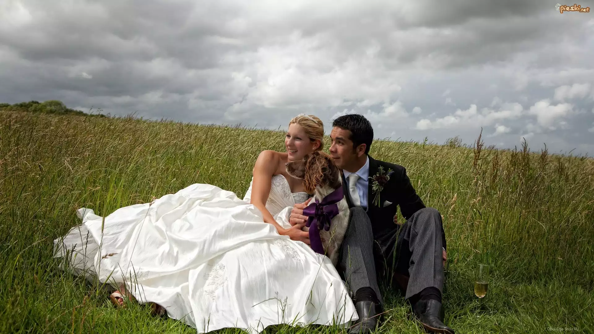 Pies Para, Młoda, Łąka, Lampka, Szampan, Biała, Suknia