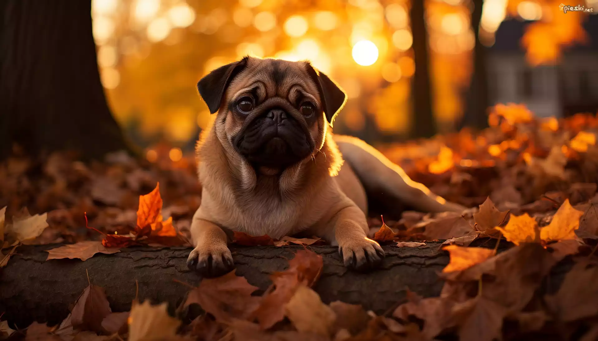 Pies Pies, Mops, Drzewo, Liście, Jesień