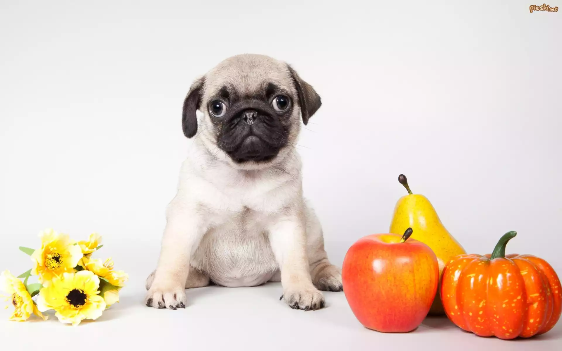 Pies, Mops, Słodki, Szczeniak, Kwiaty, Jabłko, Gruszka, Dynia